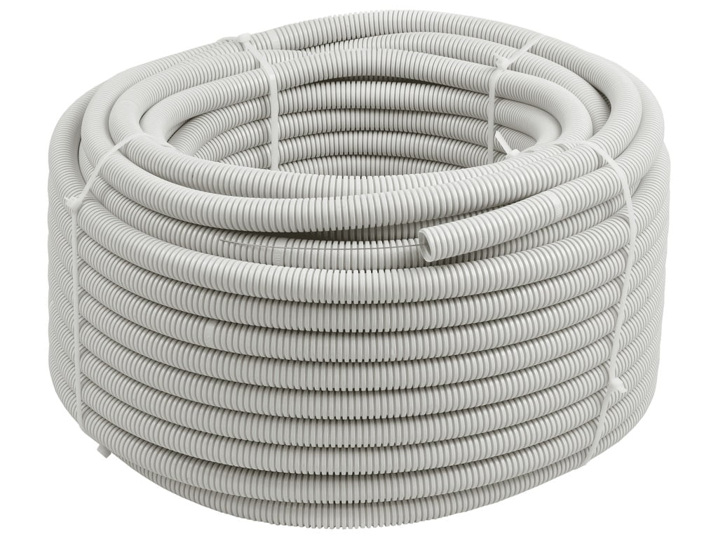 Rura instalacyjna, karbowana, giętka, nie rozprzestrzeniająca płomienia wykonana z PCV w kolorze szarym (RAL7035), ze stalowym pilotem ułatwiającym przeciąganie przewodów.